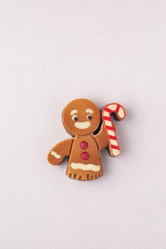 Bouchée de noël en forme de petit biscuit enrobée de chocolat dulcey et lait, praliné feuilleté.