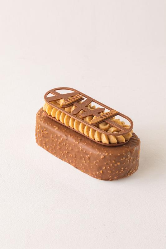 Biscuit dacquoise amande, croustillant praliné feuilleté, mousse chocolat lactée.