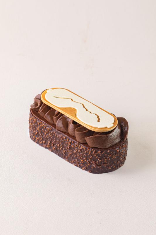Croustillant praliné, biscuit au chocolat, ganache chocolat noir, chocolat à la fleur de sel
