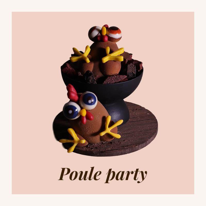 Coque en chocolat noir, lait et blanc, garnie de fritures et d'œufs pralinés assortis