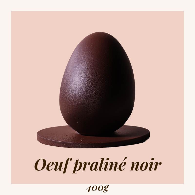 Coque en chocolat noir, garnie de praliné.